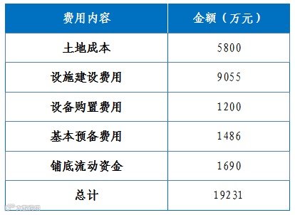项目总投资约1.9亿元,具体包括土地成本、建设改造费用、设备购置费用、基本预备费用及铺底流动资金。