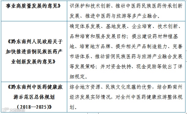《黔东南州人民政府关于加快推进苗恫民族医药产业创新发展的意见》确定体系发展、基地发展、企业培育、技术创新、品种培育和服务发展目标;提出建设药材种植基地、培育地方品牌、提升相关产品制造能力、完善市场体系、推动苗侗民族医药与旅游产业融合发展等发展策略;并对资金扶持、现金奖励等做出了详细规定。