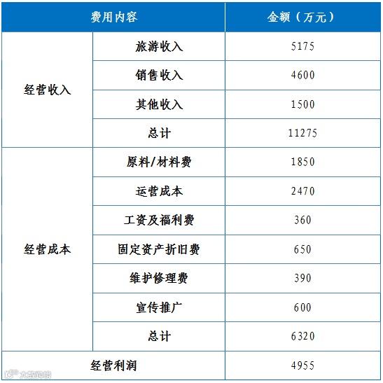 旅游收入:包括园内各类门票、采摘入场费及餐饮住宿等,基准游客量11.5万人次,基准人次均消费标准450元,总计5175万元;
