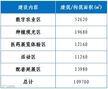 Ø 数字农业区:以数字化设施园艺为核心,以中药材种植温室大棚为主要建设内容,具体包括环境监测控制系统、数字化育苗系统、生产过程管理系统、水肥药综合管理系统等相关系统及控制室、办公室等配套建筑,总构筑面积(包含温室大棚)约52620m2。