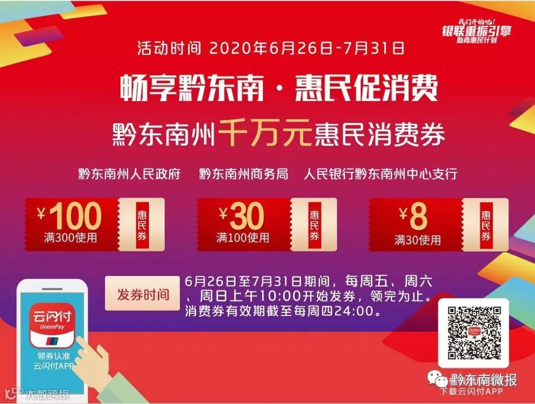 黔东南州在2020年6月26日至7月31日期间开展“畅享黔东南·惠民促消费”活动。此次活动,州级财政和中国银联股份有限公司贵州分公司联合省内各家银行共同出资一千万元,通过云闪付 APP 分批次向消费者发放畅享黔东南消费券。