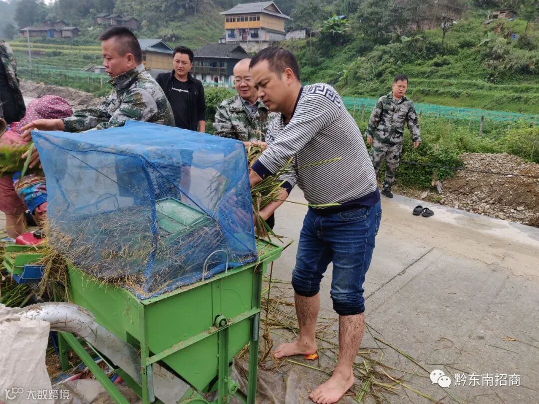 图为:州投促局派驻榕江县计划乡九秋村驻村帮扶干部(右一)帮助群众抢收稻谷