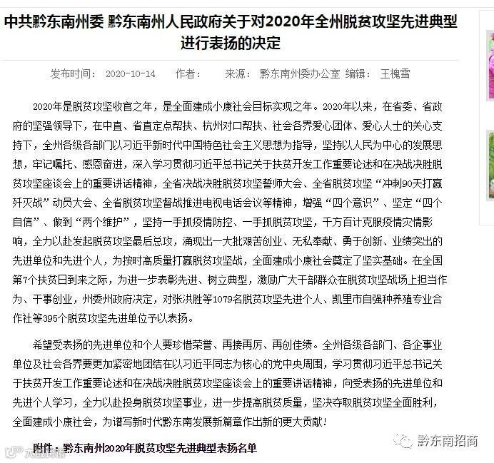 近日,黔东南州委、州政府公布了一批在脱贫攻坚战线上艰苦创业、无私奉献、勇于创新、业绩突出的先进单位和先进个人。其中,黔东南州投资促进局获评2020年度“脱贫攻坚优秀帮扶单位”、派驻到榕江县计划乡九秋村的帮扶干部个人被评为2020年度“优秀驻村帮扶干部”。