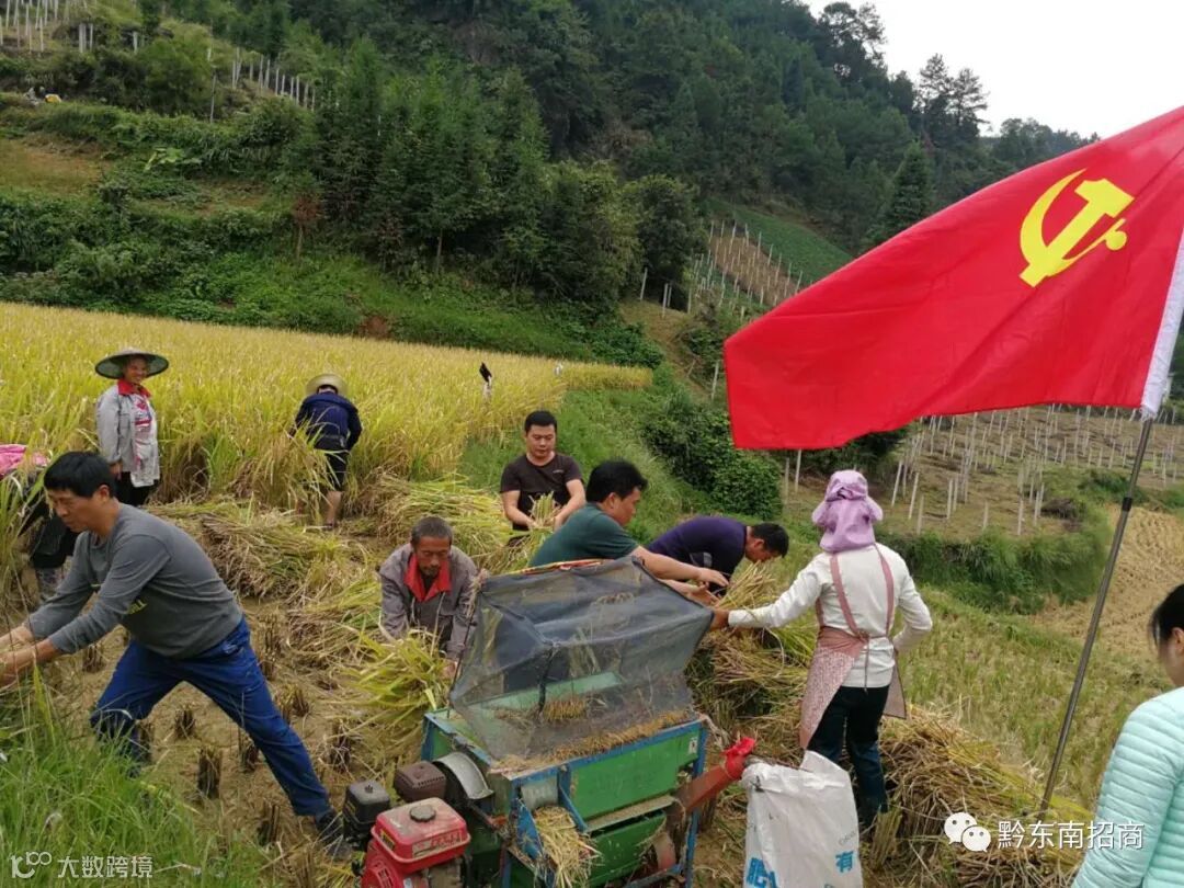 图为:黔东南州投资促进局党员干部赴帮扶村帮助群众抢收稻谷