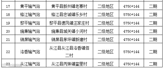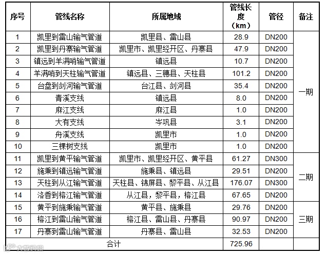 同时,根据黔东南州发展和改革委员会《关于对东黎公司县县通天然气管道分期实施事宜的复函》黔东南发改能源[2017]85号,本项目共分为三期工程,各期线路分段情况如下: