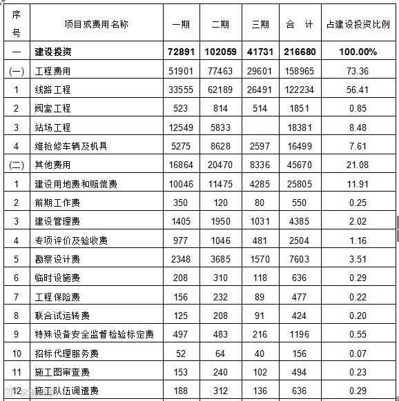 项目预期包括工程费用、其他费用和预备费,本项目建设投资合计216680万元,其中,一期工程建设投资72891万元,二期工程建设投资102059万元,三期工程建设投资41731万元,详见下表。