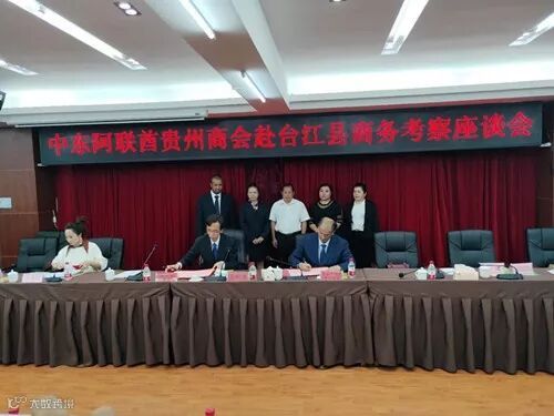 座谈会上,首先吴元主席代表县委县政府对徐会长一行到来以及对台江发展的重视表示欢迎和感谢;副县长崔洋用英语对台江县产业发展情况特别是农产品以及银饰刺绣产业做详细介绍。其次各参会企业就目前产业发展基本情况、下步发展规划做详细的推介。阿沙瑞•沙伊玛经理及徐会长等人就产品远销海外需办理的相关手续、中东地区人民消费习惯及市场需求等问题给参会企业做了介绍。最后经过双方对接洽谈达成初步合作意向。副县长崔洋、副主席许荣莉分别代表县人民政府与中东阿联酋贵州商会签订了《台江县农特产品产销战略合作框架协议书》和《友好商会协议书》。本次合作,为下步台江农特产品远销海外打下了坚实基础。