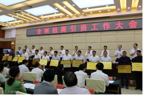 二、表扬先进,激发后进。为表扬先进,有效对接工作,州委州政府印发了《关于表扬2016年度全州招商引资工作先进单位的决定》和《关于表扬2016年度全州招商引资“十佳企业”的决定》,并在全州招商引资工作大会进授牌仪式。通过对招商引资工作作出贡献的单位和企业的表扬,表明了州委州政府强化招商引资工作的诚意和决心,进一步激发了全州上下招商引资工作激情,掀起招商引资新热潮。