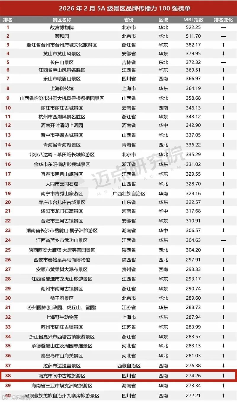 近日,迈点研究院发布2026年2月全国5A级景区品牌传播力100强榜单。