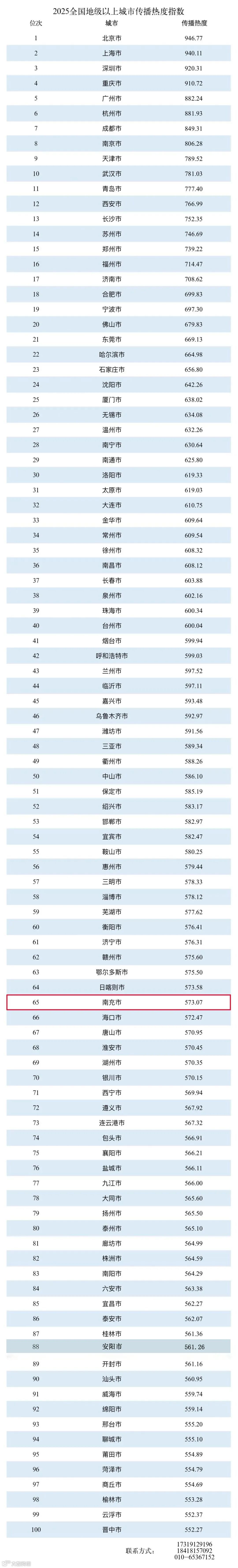2025全国城市传播热度指数前100名榜单
