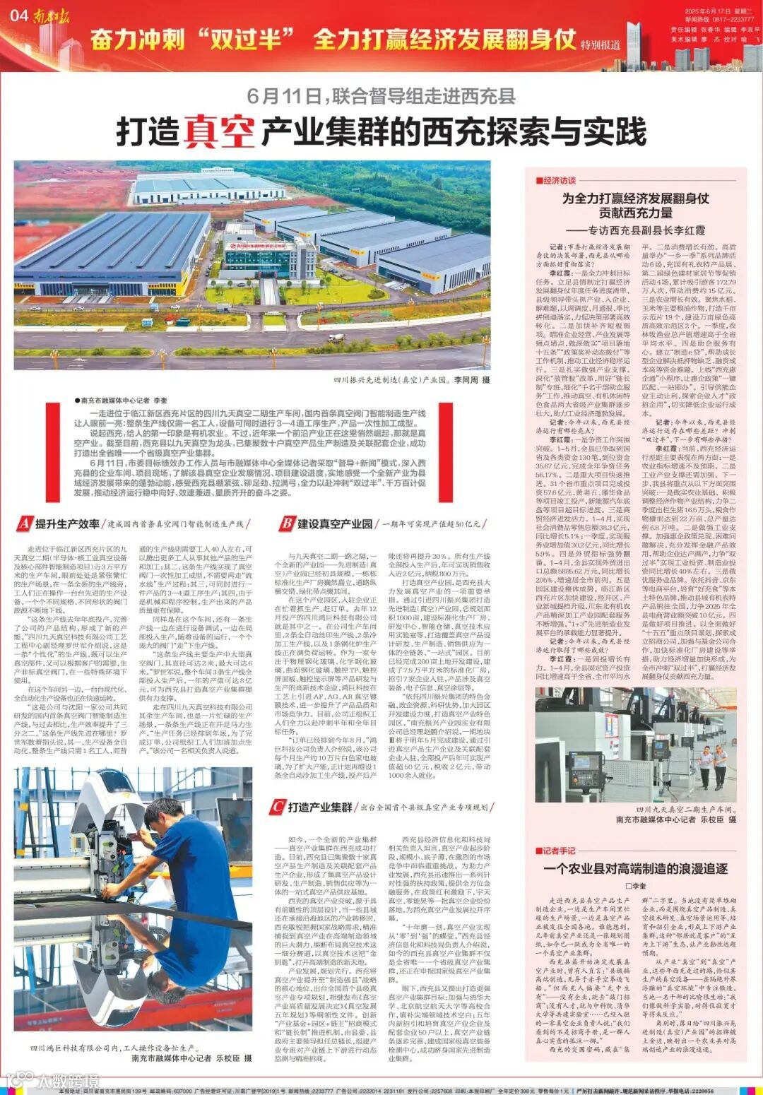西充的真空产业突破,源于具有前瞻性的顶层设计,当一些县域还在承接沿海地区的产业转移时,西充敏锐把握国家战略需求,精准捕捉到真空产业在高端制造领域的巨大潜力,果断布局真空技术这一细分赛道,以真空技术这把“金钥匙”,打开高端制造的新天地。