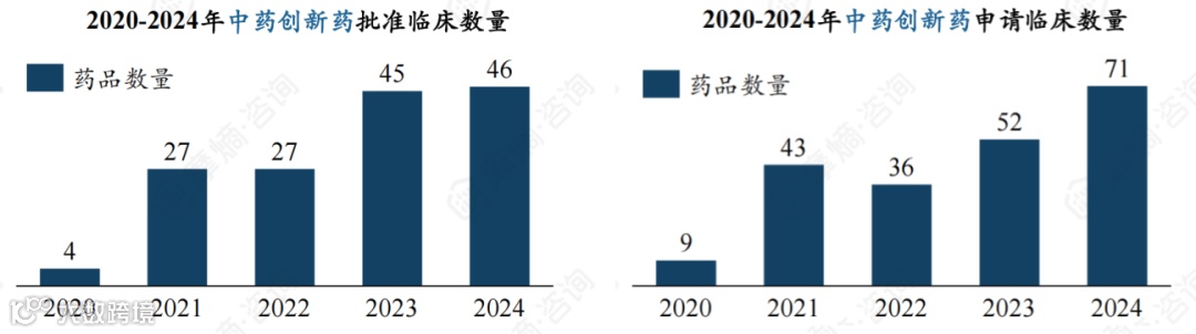 目前来看:1 类创新药(相当于顶配新机) 冲得最猛:2024 年申请临床试验的数量飙到 71 款,创了历史新高;2020 - 2024 年获批进入临床的数量更夸张,从 4 款暴增到 46 款(五年翻了 11 倍,跟新能源车销量爆发似的),五年合计 149 款,占了中药创新药的 “半壁江山”。