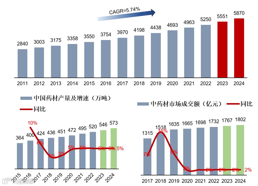 中药材堪称中药产业链的 “第一块拼图” :2011 - 2022 年,国内中药材种植面积从 2840 万亩一路 “滚雪球” 式膨胀到 5250 万亩,年均增速 5.74% ,相当于 每 12 年规模翻近一倍 。