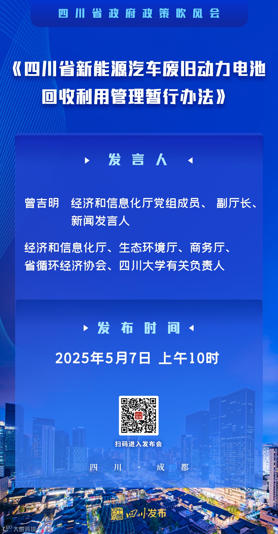 5月7日,《四川省新能源汽车废旧动力电池回收利用管理暂行办法》(简称《办法》)政策吹风会在四川新闻发布厅举行,经济和信息化厅党组成员、副厅长、新闻发言人曾吉明出席,介绍了《办法》有关情况,并回答记者提问。