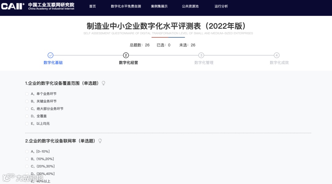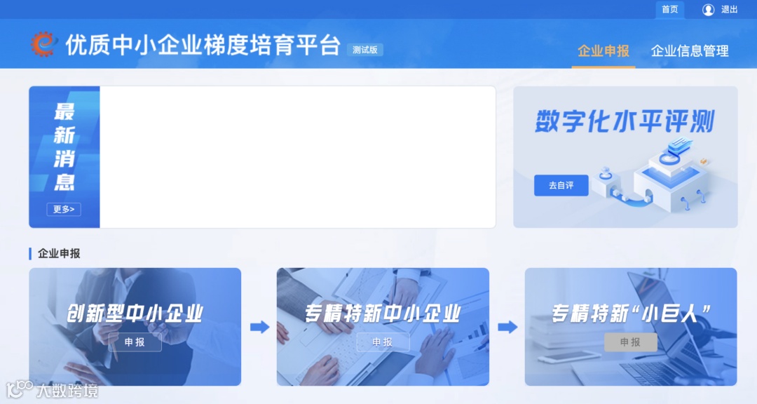 主要功能:登录状态下,企业完成数字化水平评测表,结果将作为“专精特新中小企业认定标准”第5个评价指标“数字化水平”的评价依据。