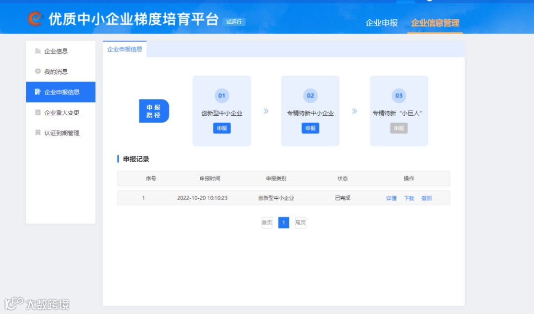 主要功能:登录状态下,完成创新型中小企业、专精特新中小企业、专精特新“小巨人”企业申报。