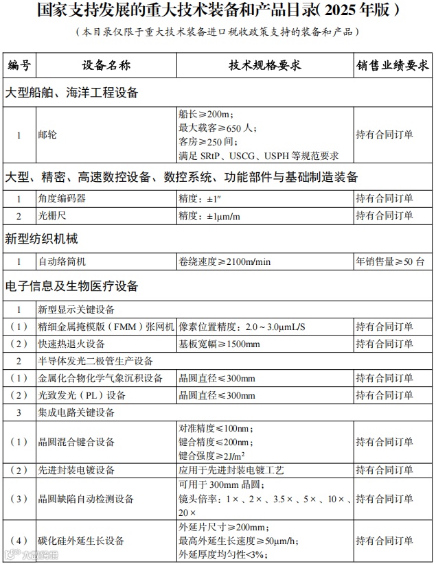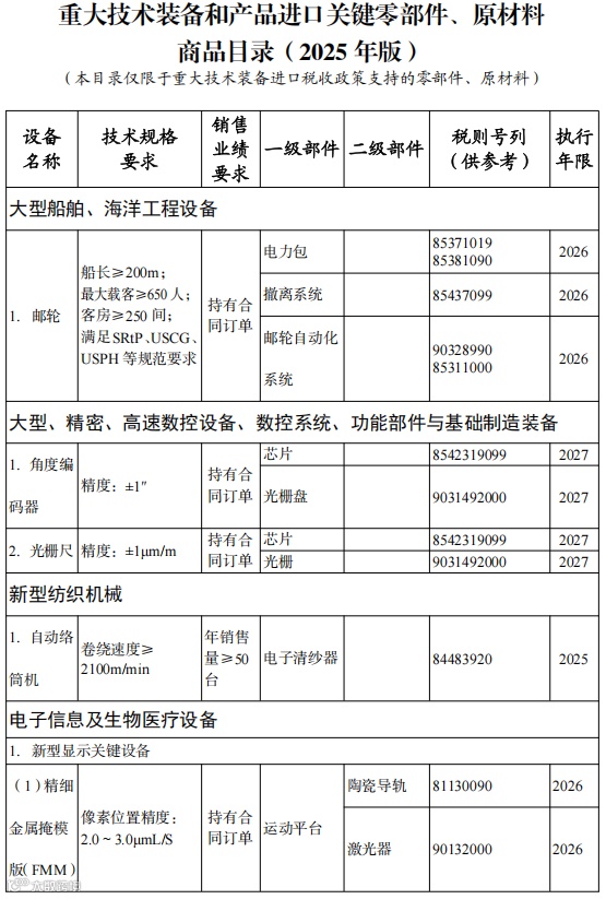 同步发布《国家支持发展的重大技术装备和产品目录(2025年版)》、《重大技术装备和产品进口关键零部件、原材料商品目录(2025年版)》和《进口不予免税的重大技术装备和产品目录(2025年版)》,自2025年3月1日起执行。
