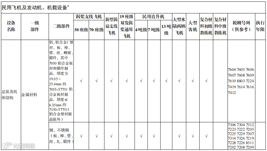 (1)铝、铝合金(型材、板、棒、管、丝、蜂窝、锻件,其中7050 铝合金板材和锻件制品,厚度为19.05~25.4mm 的7055-T7751 铝合金板材制品,厚度≤6.35mm 的7150-T77511铝合金型材制品除外)
