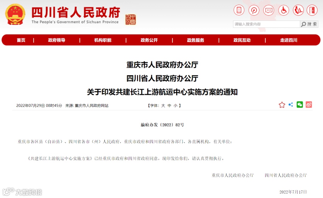 7月28日,重庆市人民政府办公厅、四川省人民政府办公厅印发了《共建长江上游航运中心实施方案》(以下简称《方案》),其中提到:力争到2025年,基本建成航运产业要素聚集、航运服务功能健全、航运市场繁荣规范、具有国际和区域航运资源配置能力的长江上游航运中心,成为“一带一路”、长江经济带、西部陆海新通道联动发展的战略性枢纽。