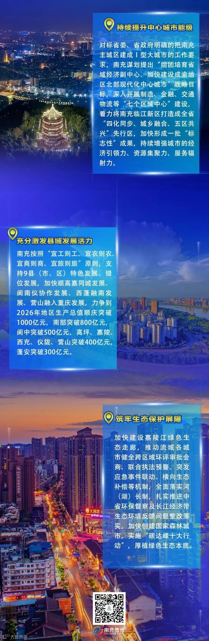 我们正按照“取得一批标志性成果、建成一批引爆性项目、创成一批国字号品牌”思路,聚力打造国家立体综合交通物流枢纽、国家区域医疗中心、国家文化旅游度假区、全国新型汽车汽配产业基地、全国特色农产品生产供应基地,持续做强城市核心功能,进一步巩固拓展南充在区域竞争中的传统优势和比较优势,持续增强城市经济引领力、资源集聚力、服务辐射力。