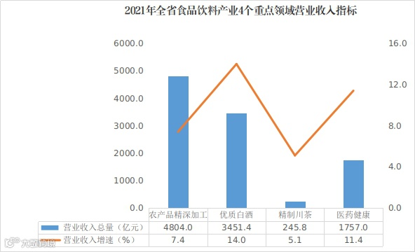 依托省领导联系指导重点产业发展机制,《推动白酒产业高质量发展的若干措施》等系列政策措施深入实施,2021年,农产品精深加工、优质白酒、精制川茶、医药健康等4个特色产业分别实现营业收入4804.0亿元、3451.4亿元、245.8亿元、1757.0亿元,分别增长7.4%、14.0%、5.1%、11.4%,优质白酒、医药健康产业利润分别增长24.9%、22.0%,细分领域的特色产业竞相发展态势明显。