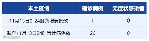 11月13日0-24时,全省新增无症状感染者1例(境外输入,为10月30日自埃及乘机抵蓉,11月13日诊断为无症状感染者),当日转为确诊病例1例,当日解除集中隔离医学观察1例,尚在集中隔离医学观察20例,比前一日减少1例。