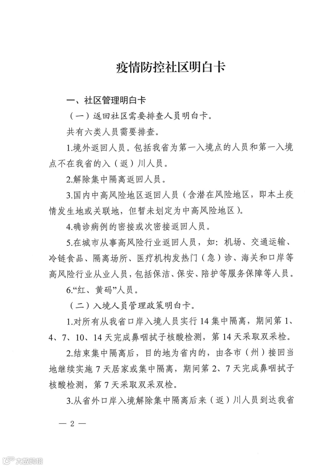 (二)入境人员管理政策明白卡。