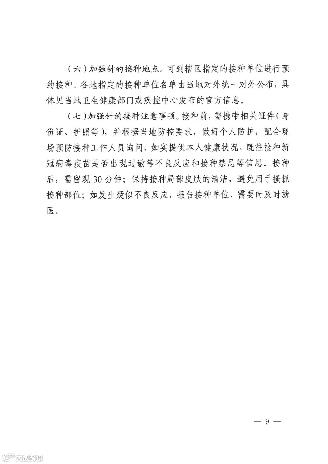 (七)加强针的接种注意事项。接种前,需携带相关证件(身 份证、护照等),并根据当地防控要求,做好个人防护,配合现 场预防接种工作人员询问,如实提供本人健康状况、既往接种新 冠病毒疫苗是否出现过敏等不良反应和接种禁忌等信息。接种 后,需留观 30分钟;保持接种局部皮肤的清洁,避免用手搔抓 接种部位;如发生疑似不良反应,报告接种单位,需要时及时就医 。