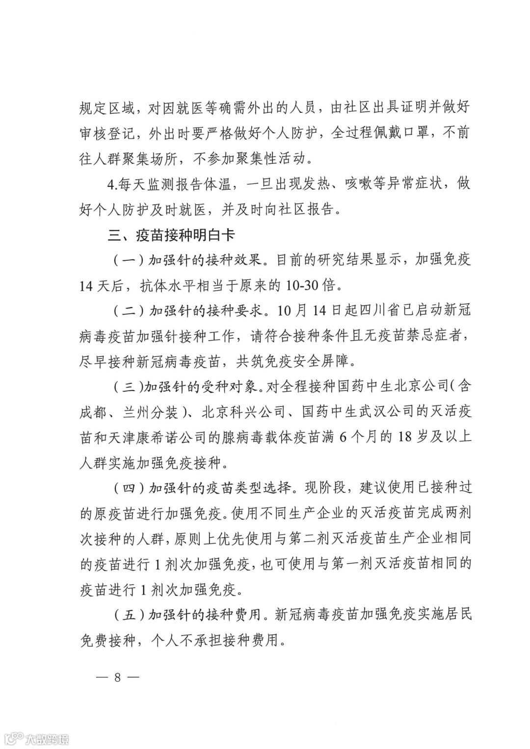 (二)加强针的接种要求。10 月14 日起四川省已启动新冠 病毒疫苗加强针接种工作,请符合接种条件且无疫苗禁忌症者,尽早接种新冠病毒疫苗,共筑免疫安全屏障。