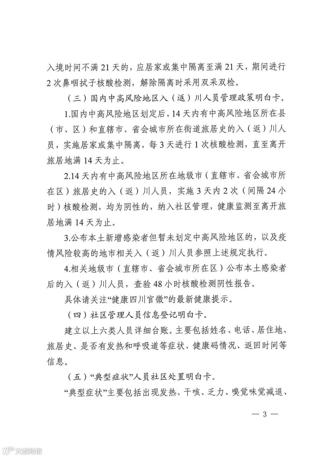 3.公布本土新增感染者但暂未划定中高风险地区的,以及疫情风险较高的地市相关入(返)川人员参照上述规定执行。