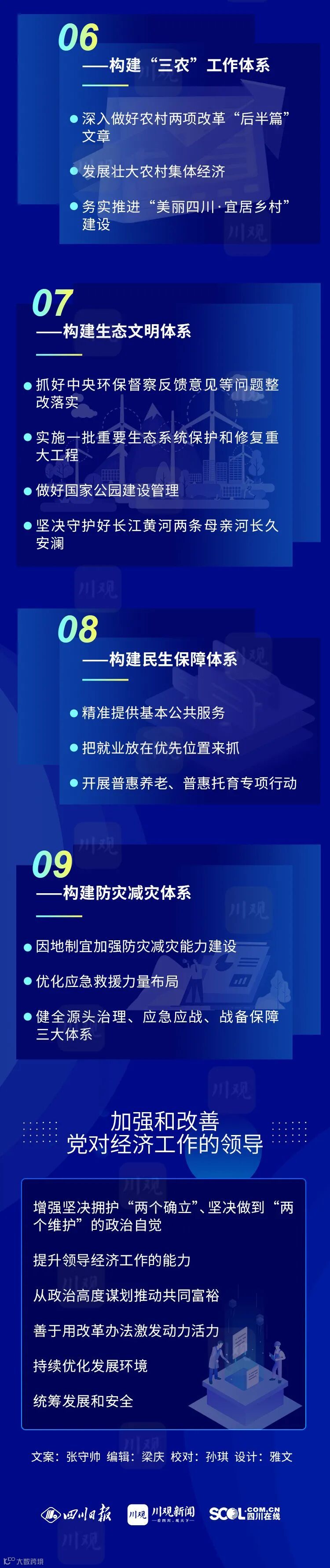 要构建“三农”工作体系。以片区为单元加快编制乡村国土空间规划,深入做好农村两项改革“后半篇”文章,发展壮大农村集体经济,务实推进“美丽四川·宜居乡村”建设,执行最严格的耕地保护制度,提高农业综合生产能力,切实把农业生产搞好、把农村社会管好、把农民事情办好,牢牢稳住“三农”基本盘。