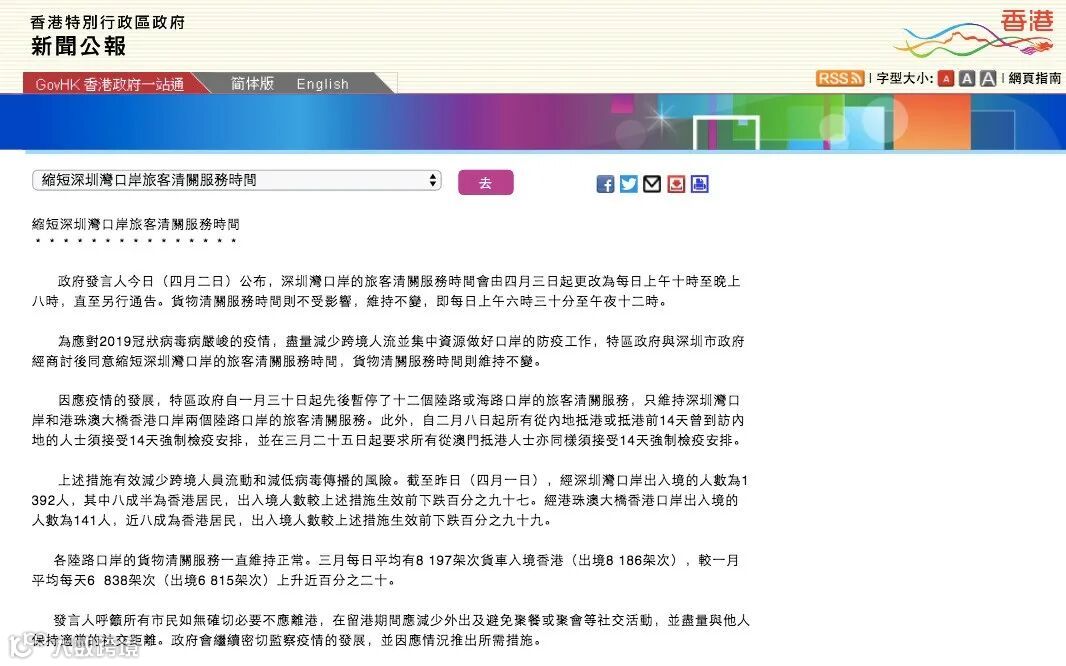 香港特区政府4月2日公布,由4月3日起,深圳湾口岸的旅客清关服务时间,更改为每日上午10时至晚上8时,直至另行通告。货物清关服务时间则不受影响,维持不变,即每日上午6时30分至午夜12时。