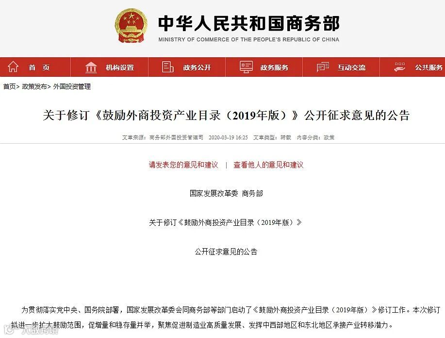 公告称指出,在2020年4月18日前,登陆国家发展改革委门户网站首页“意见征求”专栏或商务部门户网站首页“征求意见”专栏,进入“关于修订《鼓励外商投资产业目录(2019年版)》公开征求意见的公告”,提出意见建议。