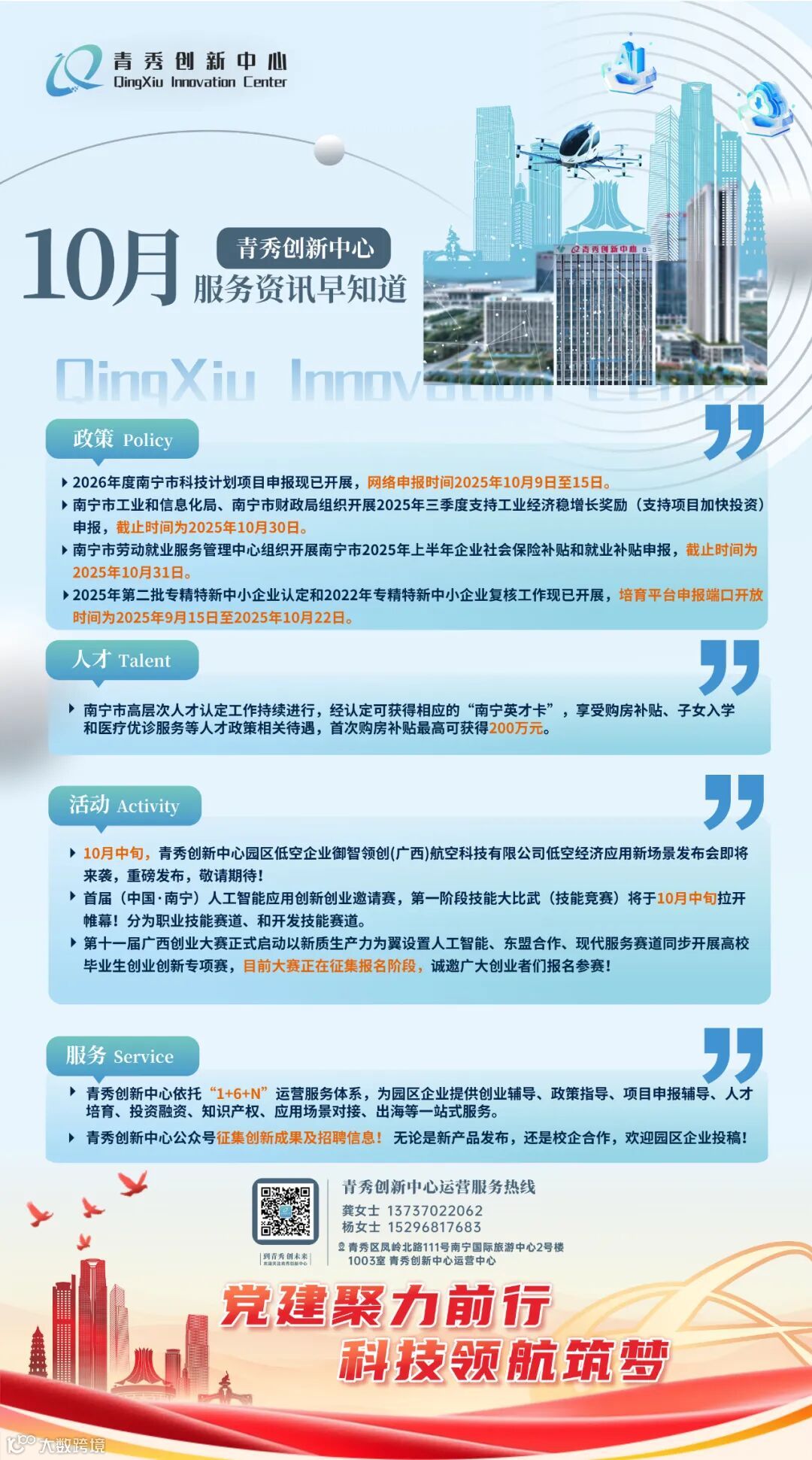 服务快讯 | 叮!青秀创新中心10月资讯早知道来啦!