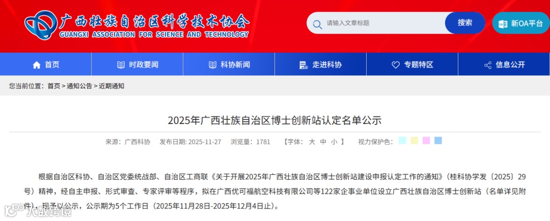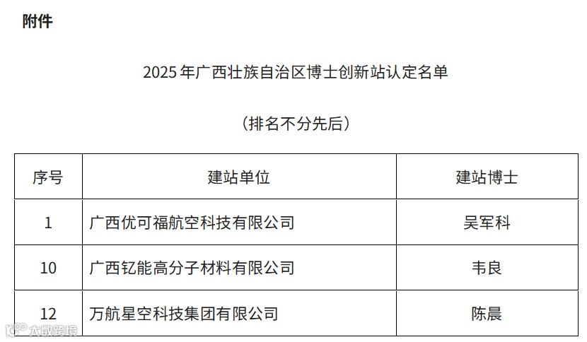 近日,自治区科学技术协会官网公示了2025年广西壮族自治区博士创新站认定名单,青秀创新中心入驻企业广西优可福航空科技有限公司、广西钇能高分子材料有限公司、万航星空科技集团有限公司三家凭借突出的科技创新能力与人才引领实力,成功入选!