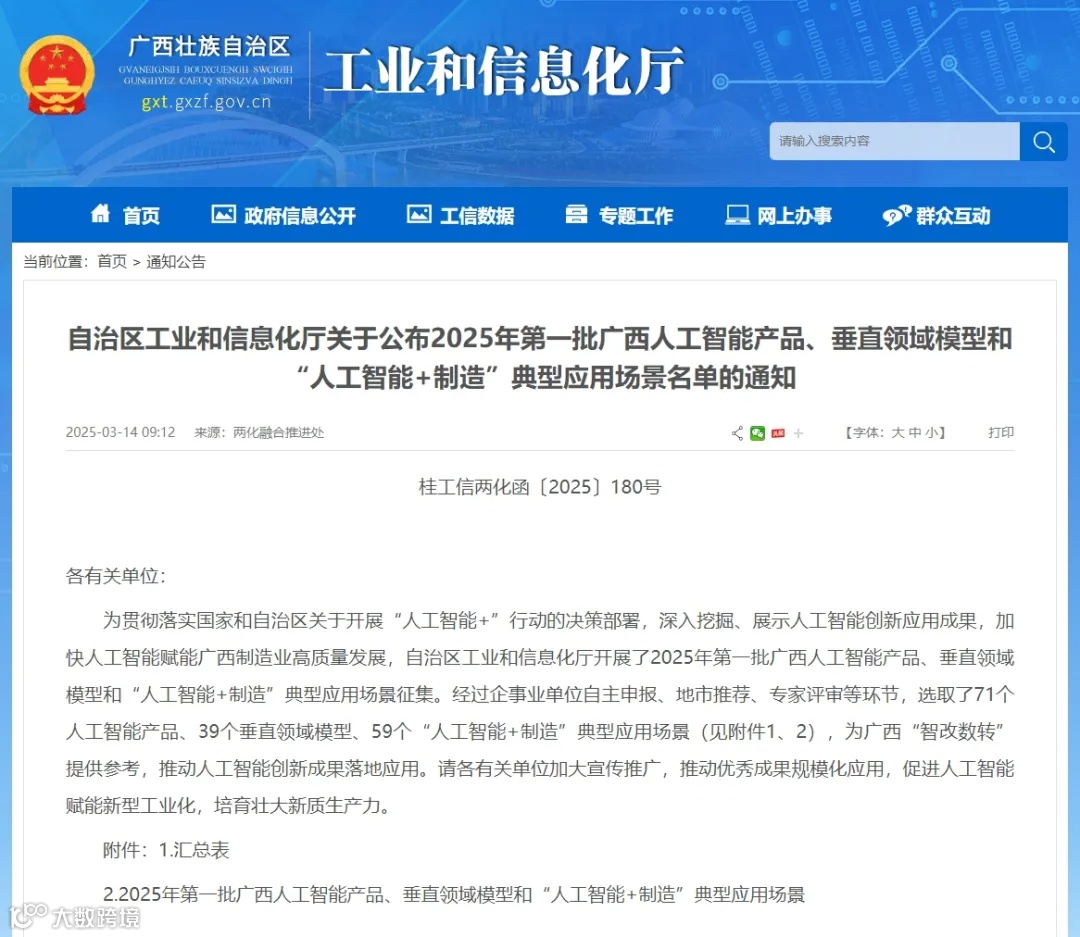 3月13日,自治区工业和信息化厅公布2025年第一批广西人工智能产品、垂直领域模型和“人工智能+制造”典型应用场景名单,青秀创新中心园区企业广西瞪羚科技有限公司申报的“建筑工程安全管理”入选垂直领域模型名单并面向全区推介。