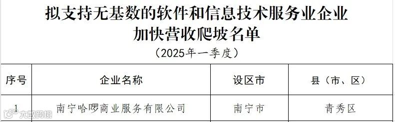 自治区工业和信息化厅公布2025年一季度“开门红”鼓励企业稳生产促就业政策拟支持软件和信息技术服务业企业名单。青秀创新中心园区企业南宁哈啰商业服务有限公司入选拟支持无基数的软件和信息技术服务业企业加快营收爬坡名单。