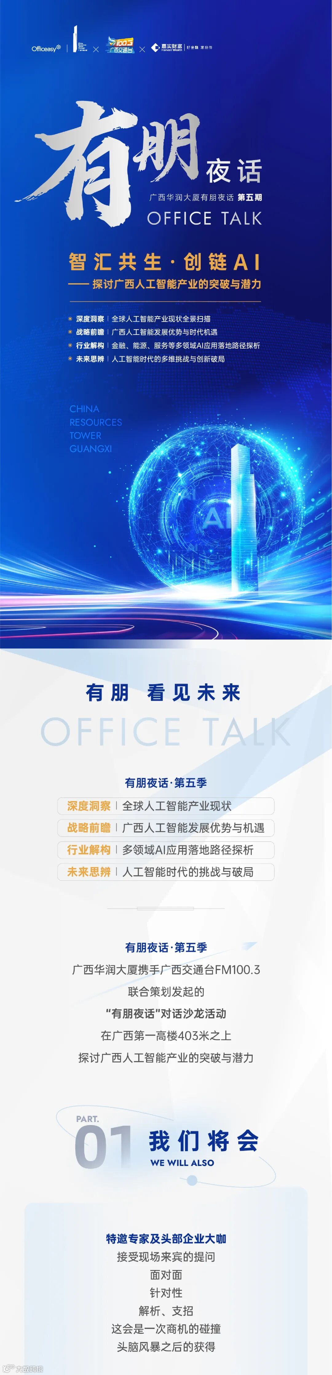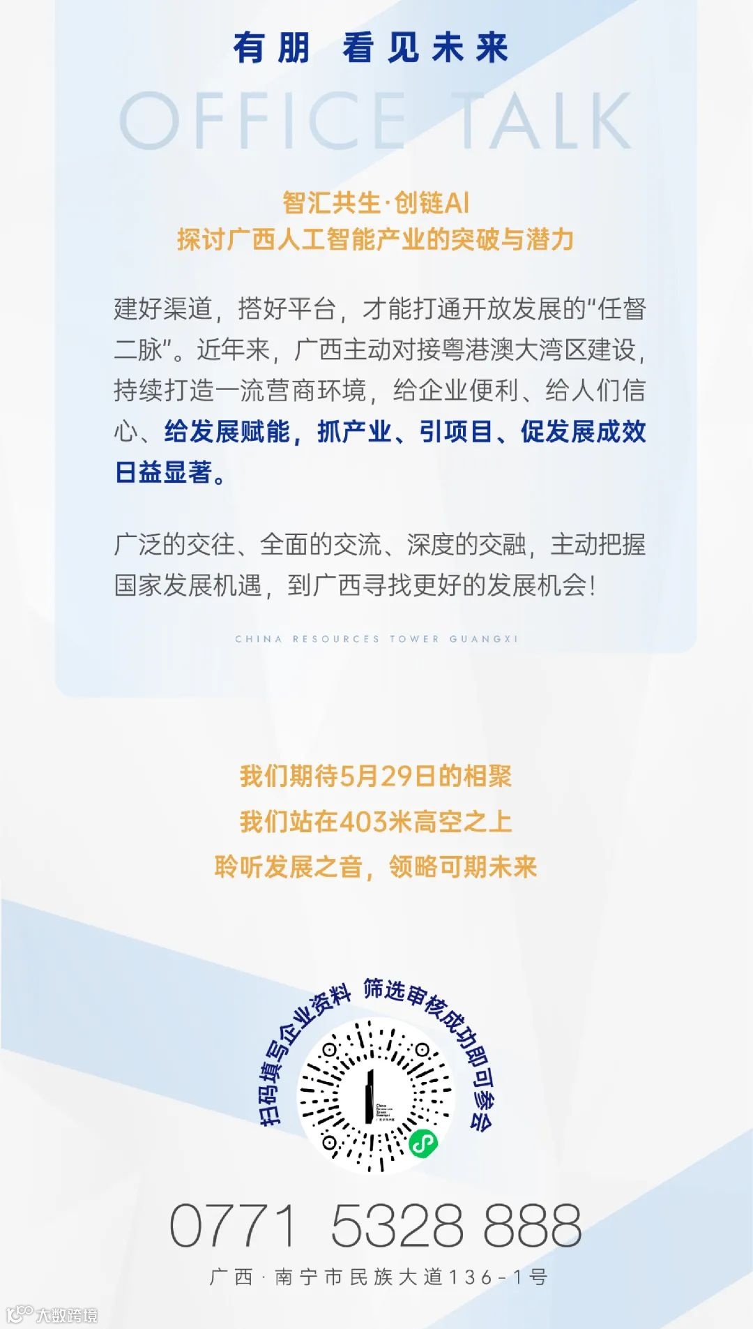 智汇共生·创链AI,由青秀创新中心(华润置地广西)协同发展区策划发起的“有朋夜话”第五期将于5月29日举行,届时,活动将邀请诸多业内大咖共同探讨广西人工智能产业的突破与潜力。欢迎企业扫描海报下方二维码报名参与!
