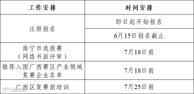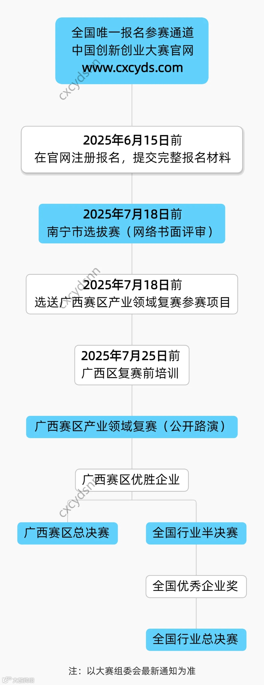 南宁市选拔赛(网络书面评审)→选送广西赛区产业领域复赛参赛项目→广西区复赛前培训→广西赛区产业领域复赛(公开路演)→入围广西赛区总决赛(公开路演)→入围全国赛区总决赛(公开路演)→优秀参赛项目跟踪服务与政策落实