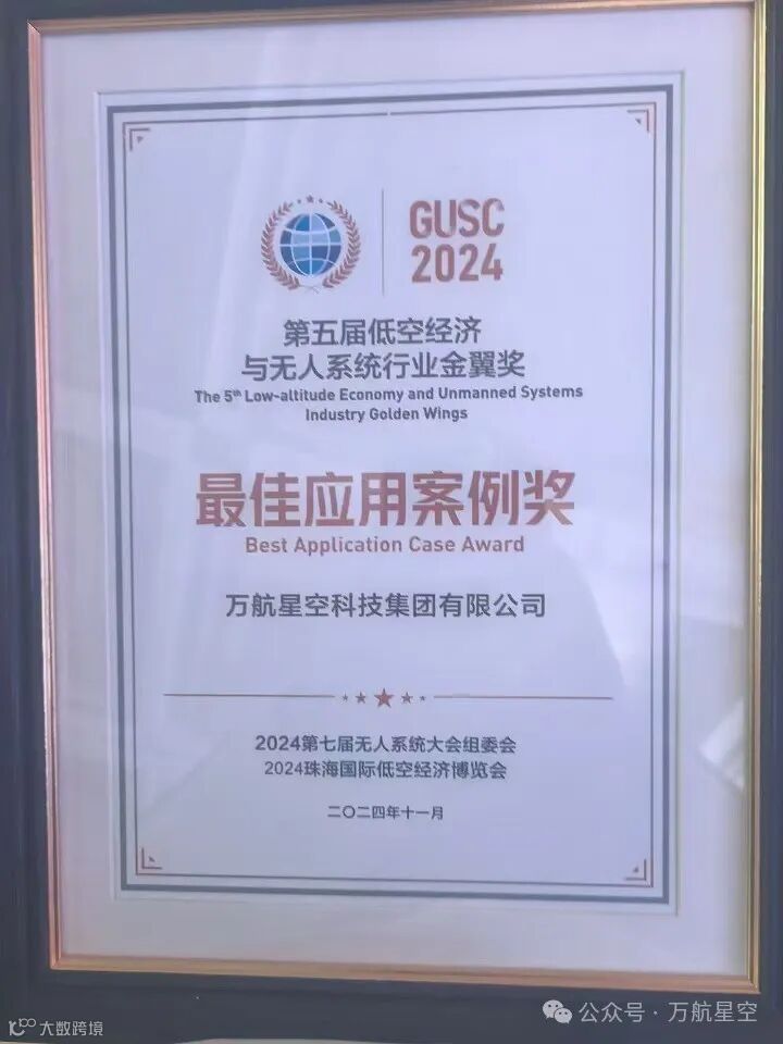 论坛结束后,第五届低空经济与无人系统行业“金翼奖”颁奖仪式隆重举行。万航星空集团凭借“空地水”数字水利解决方案荣获“最佳应用案例奖”。这一奖项不仅是对万航星空在多样化应用场景中卓越能力的认可,更是对其在低空经济领域内所做出贡献的高度赞扬。