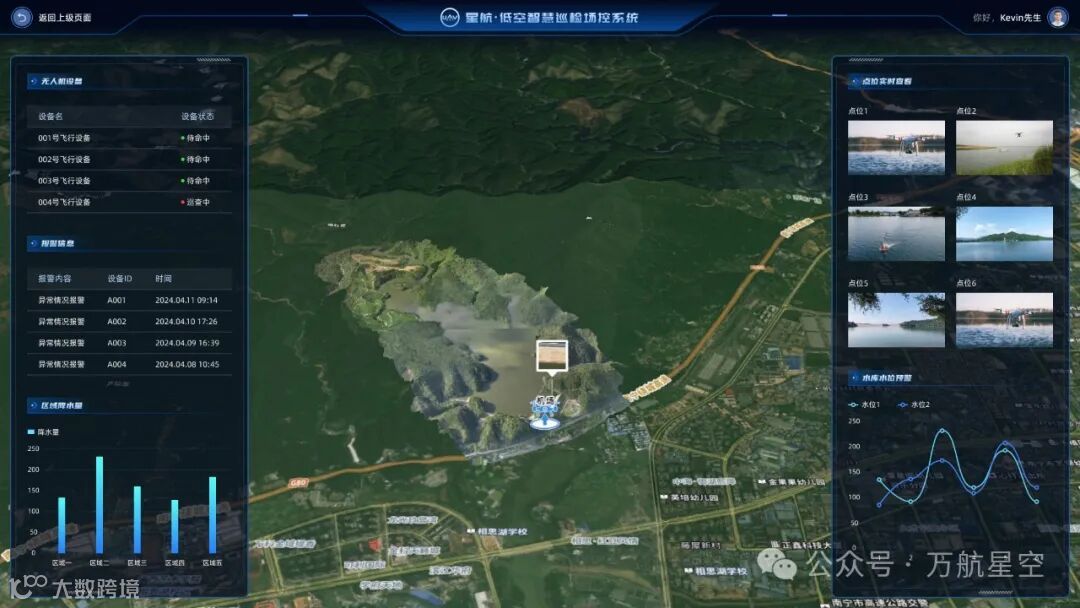 星航系统配备智慧水务大数据综合管控大屏,集飞行监控、地面监控、水利监测设备监控与一体,形成“天上看,地上查,云端管”的空天地水一体化监测网,为智慧水务保驾护航。
