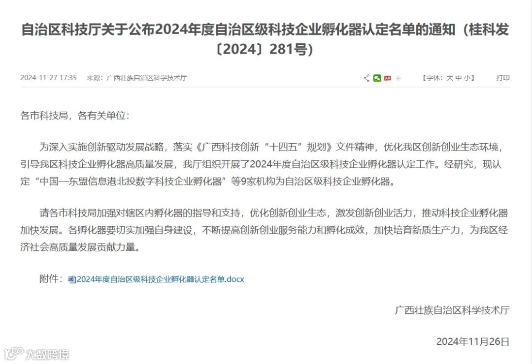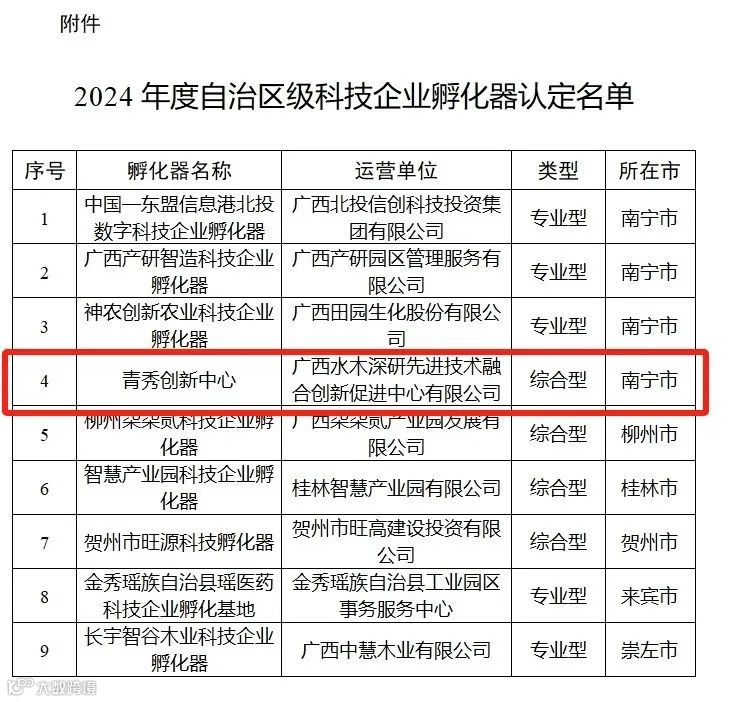 11月27日,广西壮族自治区科学技术厅发布《自治区科技厅关于公布2024年度自治区级科技企业孵化器认定名单的通知(桂科发〔2024〕281号)。青秀创新中心认定为自治区级科技企业孵化器,标志着青秀创新中心在科技创新孵化服务工作中迈上新台阶!