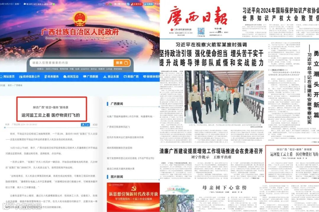 ① 10月20日,《中国广西政府网》《广西日报》头版以《探访广西“低空+服务”新场景》为题,聚焦报道青秀创新中心园区企业关于“低空+服务”创新场景应用。