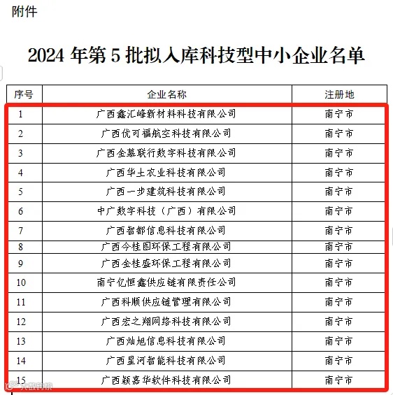 ② 近日,自治区2024年第5批拟入库科技型中小企业名单已公示,广西优可福航空科技有限公司、广西智都信息科技有限公司等15家园区企业成功获评2024年第5批拟入库科技型中小企业!