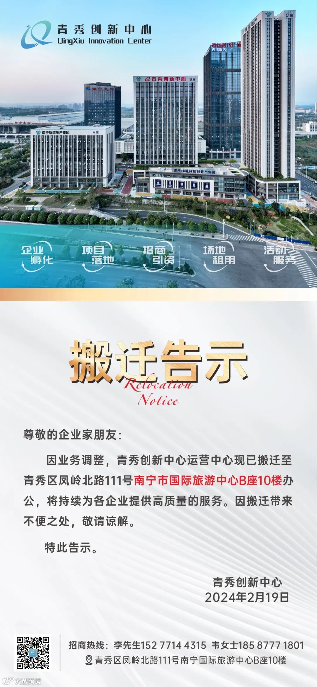 青秀创新中心运营中心搬迁告示