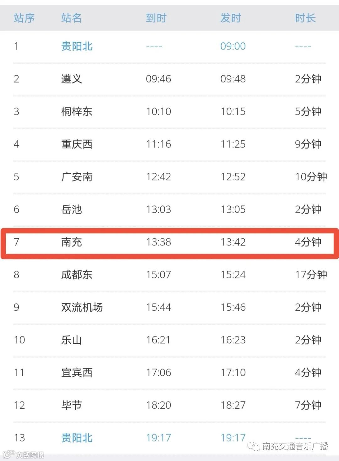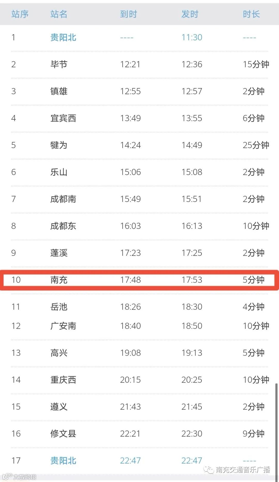 从南充火车站获悉,从5月2日开始,中国铁路成都局集团有限公司新开C6177次(贵阳北9:00始发,沿途经过遵义、桐梓东、重庆西、广安南、岳池、南充、成都东、双流机场、乐山、宜宾西、毕节、终到站贵阳北站19:17);