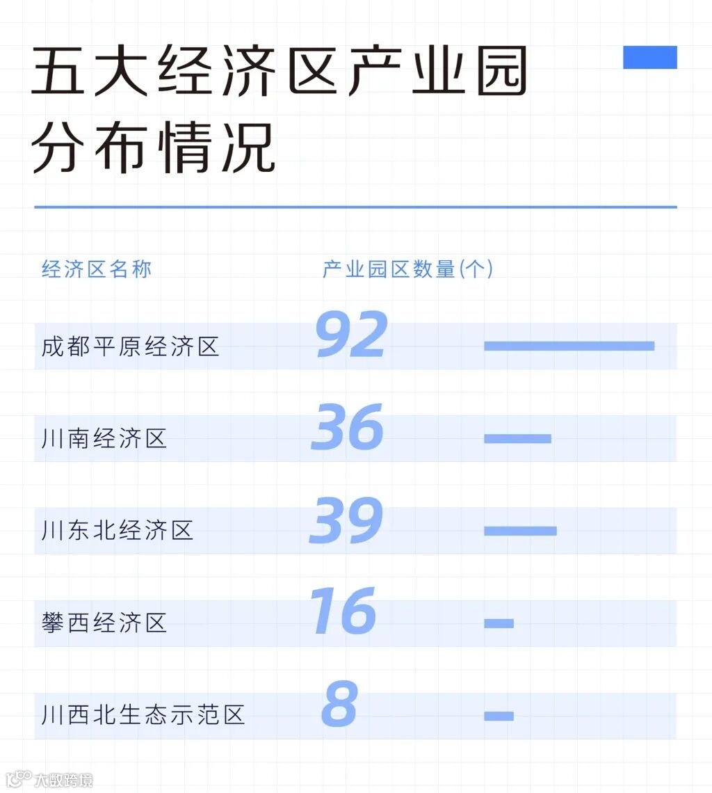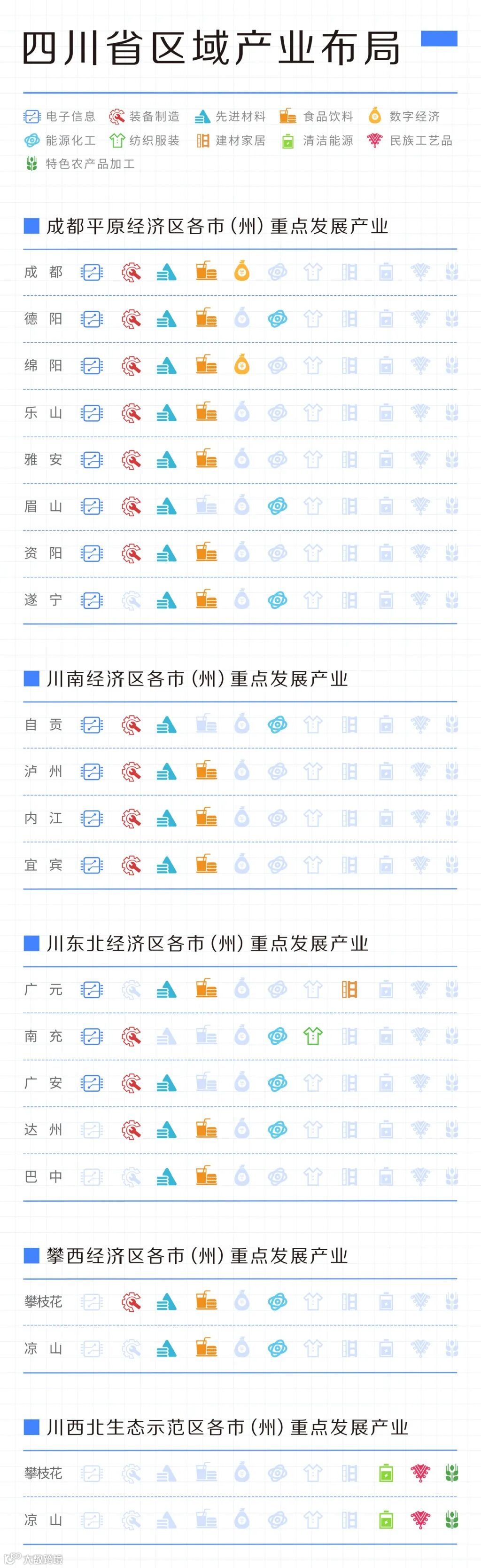 如成都市将重点发展电子信息、装备制造、先进材料、食品饮料产业和数字经济;环成都经济圈中,德阳市将重点放在工业转型升级,做大做强高端装备制造业,培育壮大战略性新兴产业,加快改造提升传统产业;绵阳市打造创新驱动发展的试验田和西部地区发展的增长极;遂宁市则积极融入成渝城市群建设,加强与两大中心城市对接配套,建设成渝发展主轴绿色经济强市。