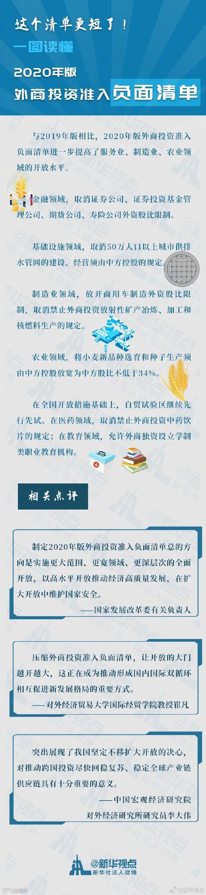 今年以来,新冠肺炎疫情给全球跨国投资带来巨大冲击,世界经济受到严重影响。发布2020年版外商投资准入负面清单,是贯彻落实党中央、国务院部署,实施更大范围、更宽领域、更深层次全面开放的重要举措,也是《外商投资法》施行后,推进负面清单管理制度的最新配套文件,展示了我国坚定不移支持经济全球化和跨国投资的决心,将进一步完善外商投资环境,以更高水平开放促进经济高质量发展。