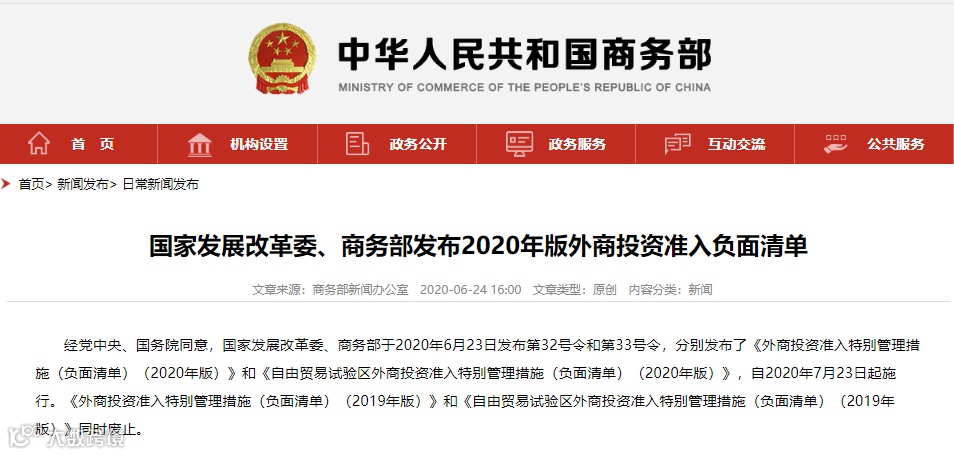 经党中央、国务院同意,国家发展改革委、商务部于2020年6月23日发布第32号令和第33号令,分别发布了《外商投资准入特别管理措施(负面清单)(2020年版)》和《自由贸易试验区外商投资准入特别管理措施(负面清单)(2020年版)》,自2020年7月23日起施行。《外商投资准入特别管理措施(负面清单)(2019年版)》和《自由贸易试验区外商投资准入特别管理措施(负面清单)(2019年版)》同时废止。