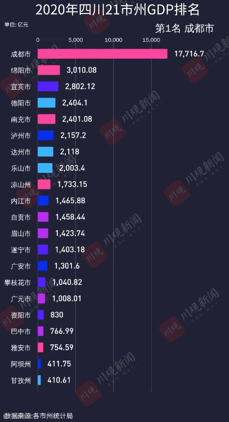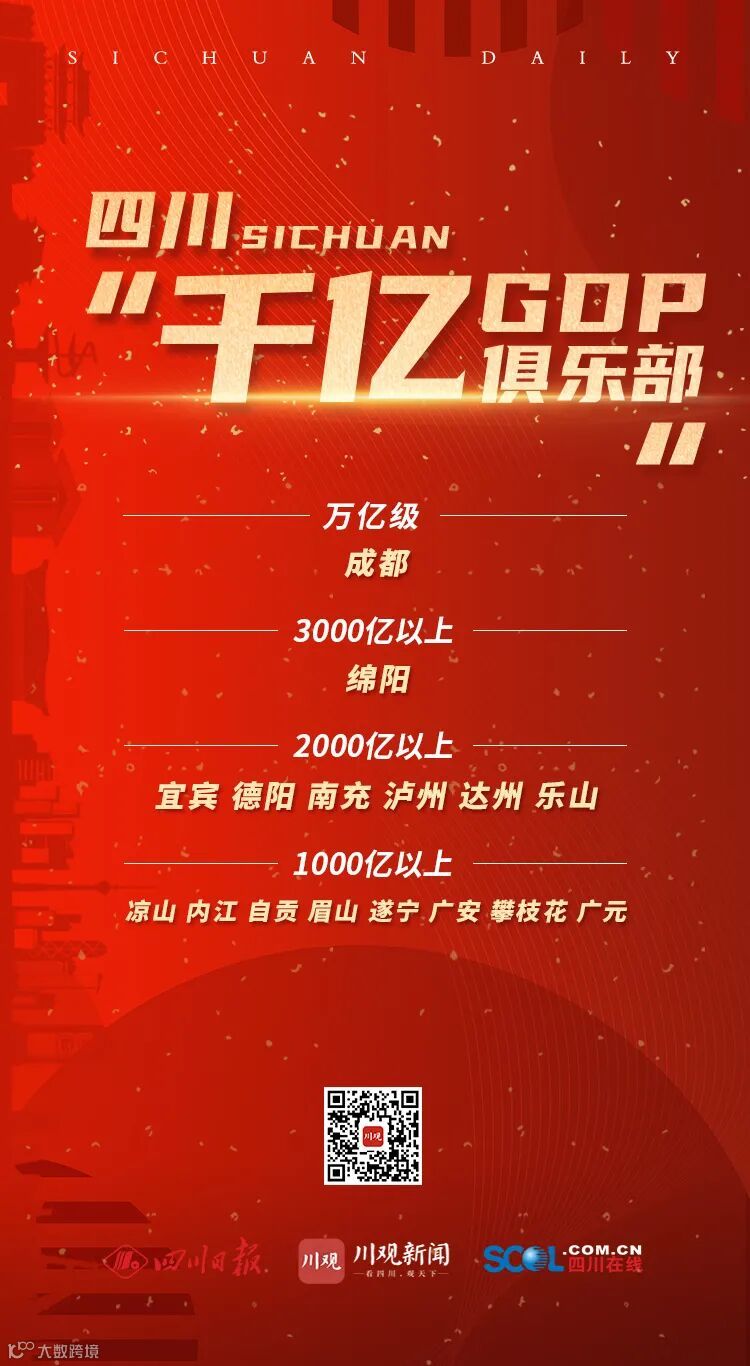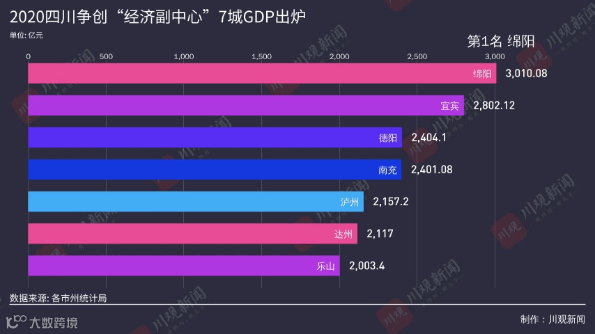 随着1月21日省统计局发布2020年全省经济运行情况,四川各市州也相继揭晓过去一年的成绩单:绵阳首次突破3000亿元大关,宜宾触线2800亿元,乐山迈入2000亿元门槛,这意味着四川跻身“两千亿”GDP俱乐部的市州达到7个(不含成都),相比2017年增加了6个。